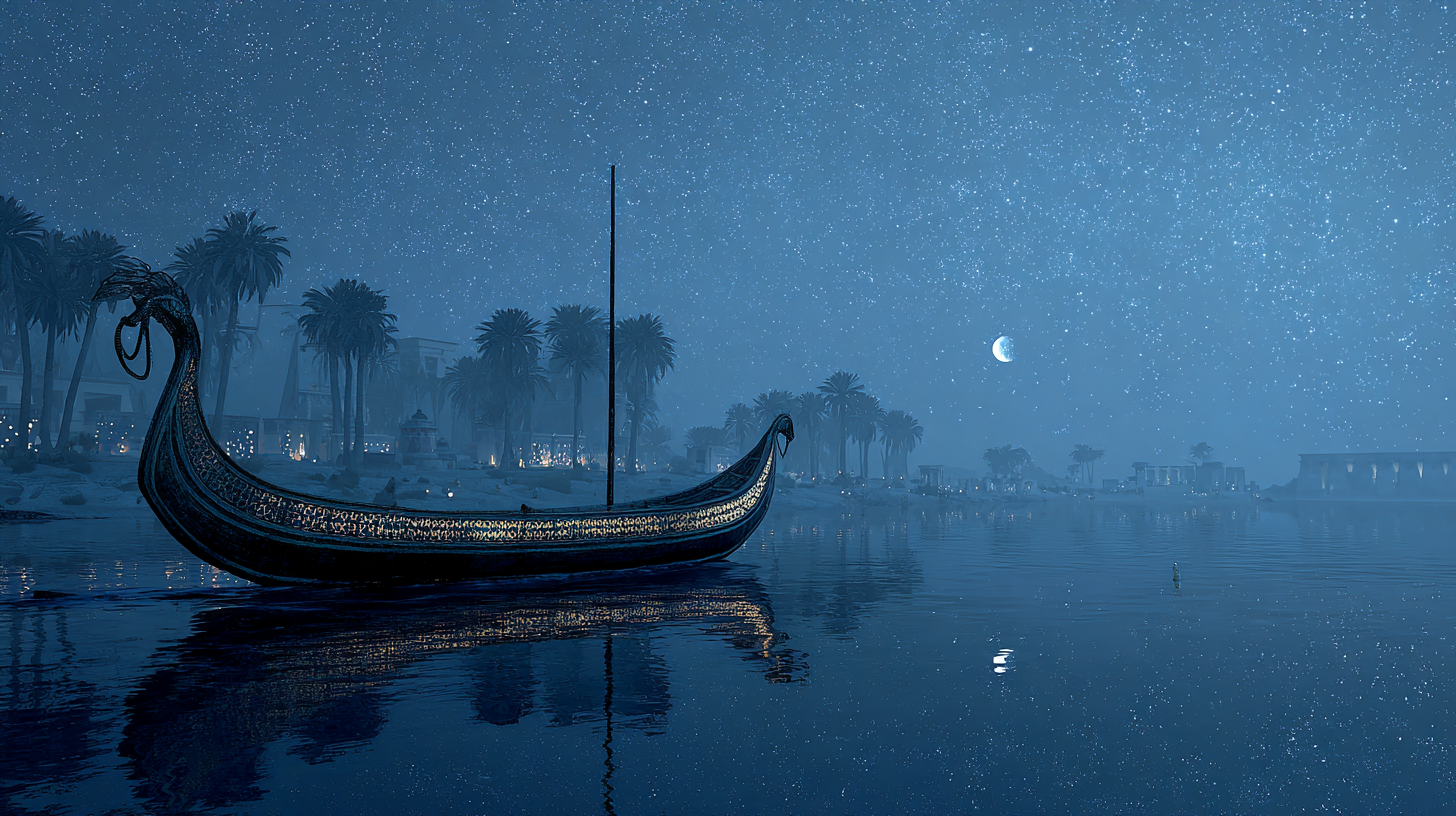 The boat that descends the Nile in secret, and shadow, under the light of the Moon in search of truth, coherence, and relation. To restore what has been separated, lost, and unseen through the light of the day, and what becomes can only be witnessed in the silvery light, in the reflection of the water and the depths beneath.