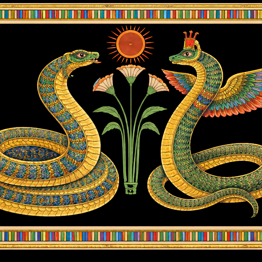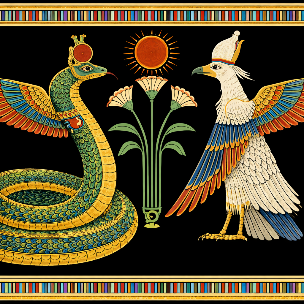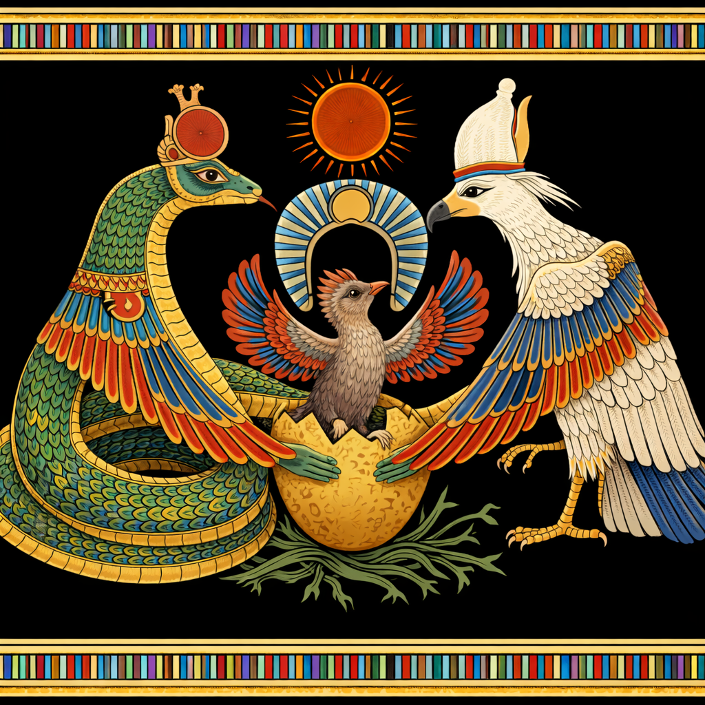 Through these journeys, the chaotic void of the serpent transforms to the winged protector, the mother who holds in flight to the bird who rises from the depths of creation, uniting solar will with receptive lunar body, alighting atop the unified heart of the Nile, the BenBen.